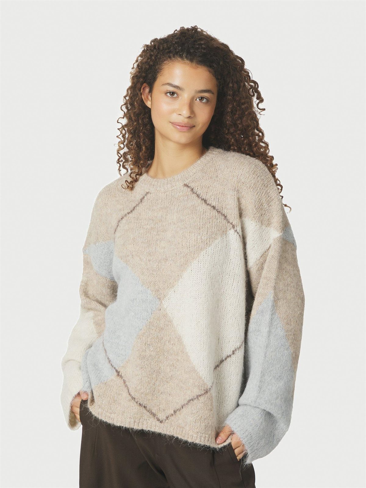 Virkelig cool og trendy oversize strikbluse i et flot argyle-mønster fra Neo Noir. Inga Check Fluff Knit Blouse er lavet i en dejlig blød fluffy kvalitet. Strikken er i en let oversize pasform med løse ærmer og rund halsudskæring. Virkelig flot at style udenover en lang skjorte, til jeans eller et smuk skirt som på billedet.