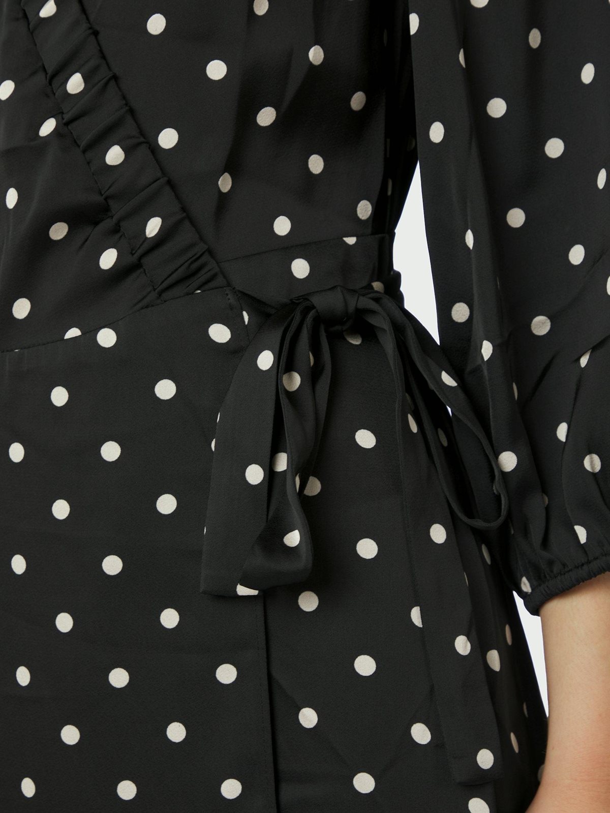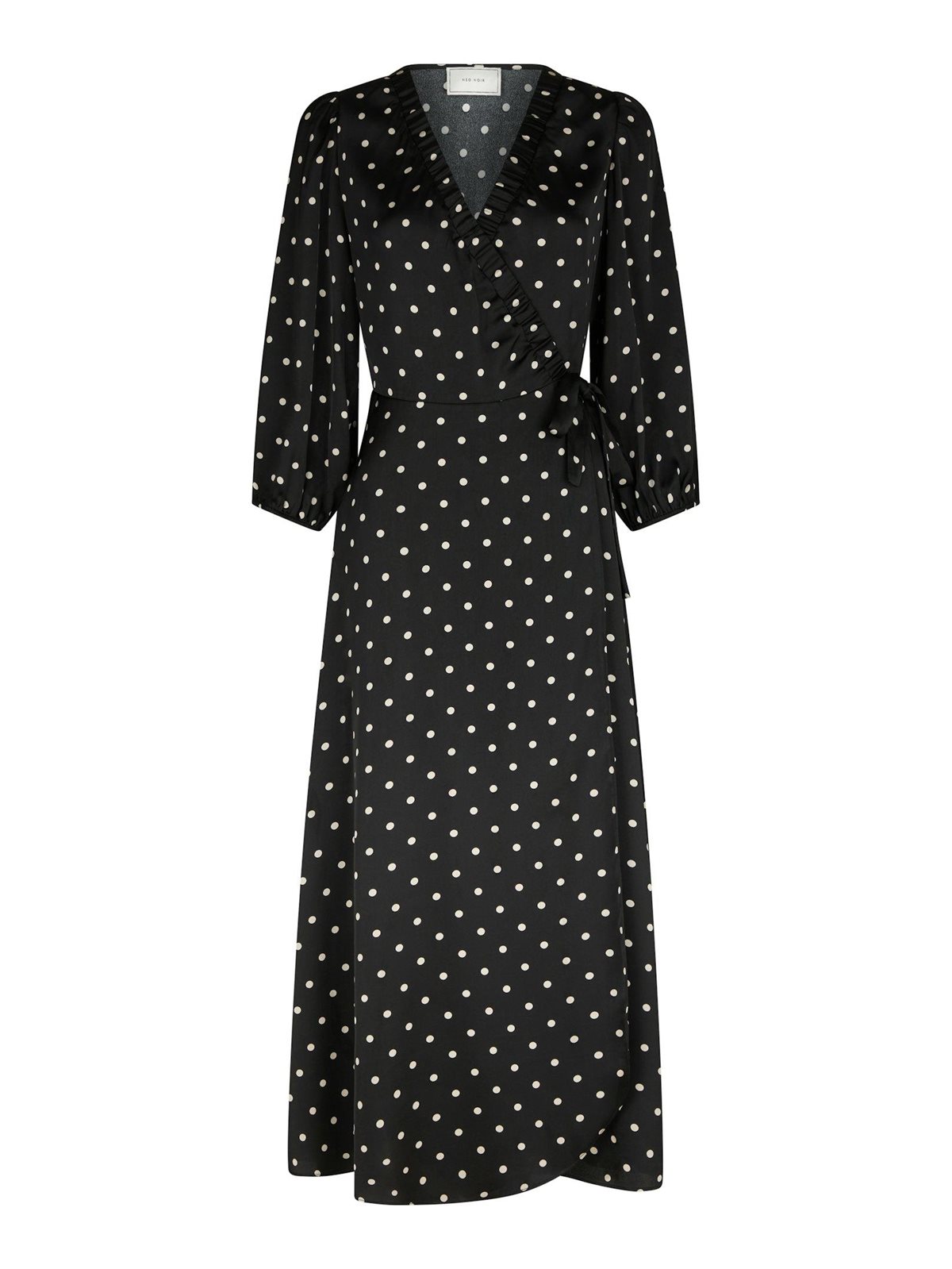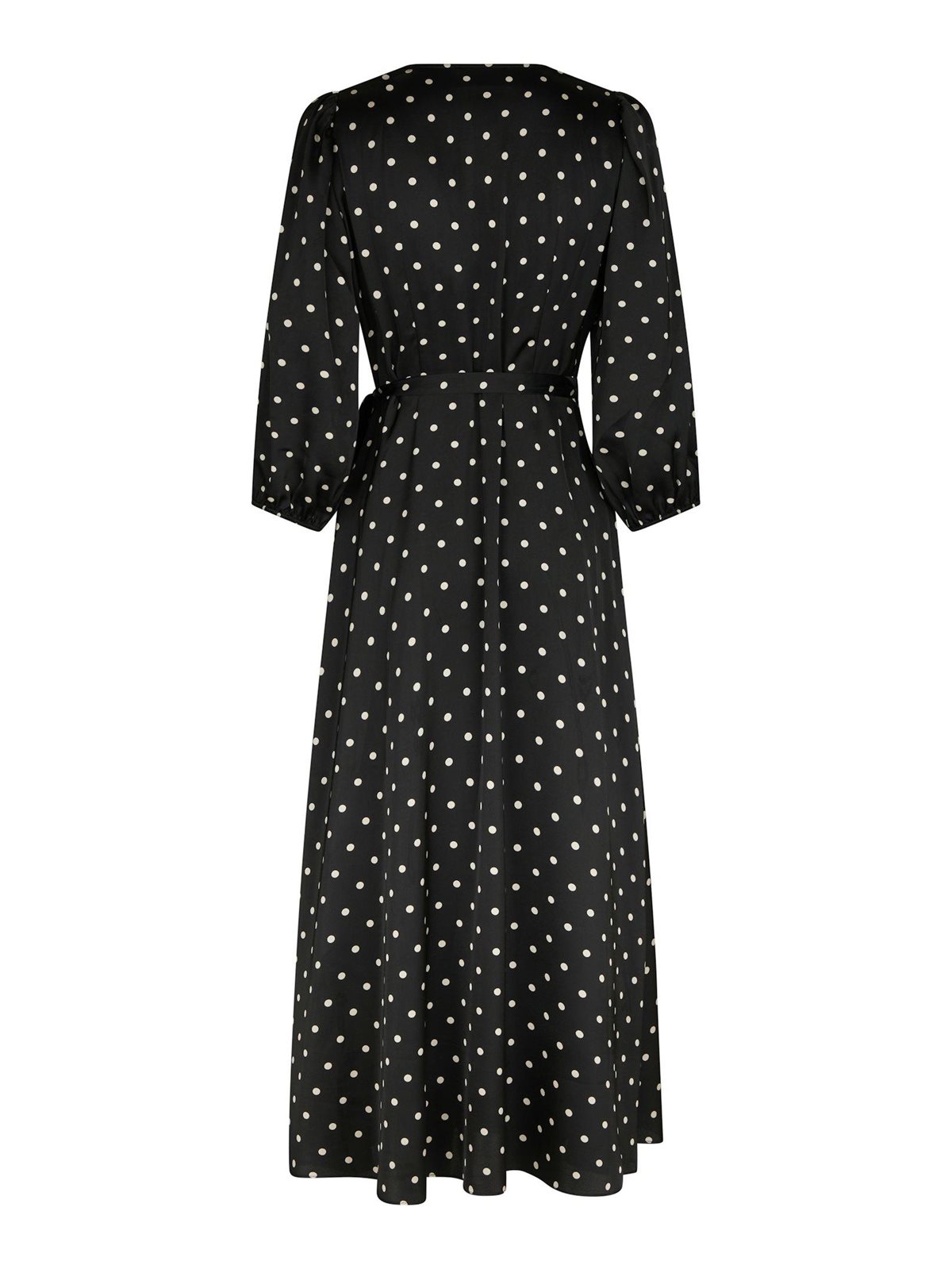 Så fin og feminin slåom-kjole fra Neo Noir i sort med råhvide prikker. Malinga Dot Dress er en midi lang kjole med omslagseffekt og trekvart ærmer i en flot satinkvalitet med let shine. Kjolen har uddybning i front med elastik, som giver et let draperet udseende. En virkelig flot og elegant kjole, der er oplagt til fest.