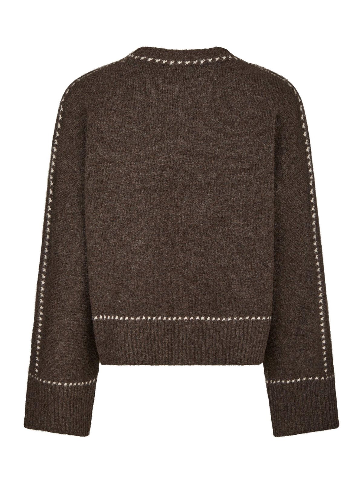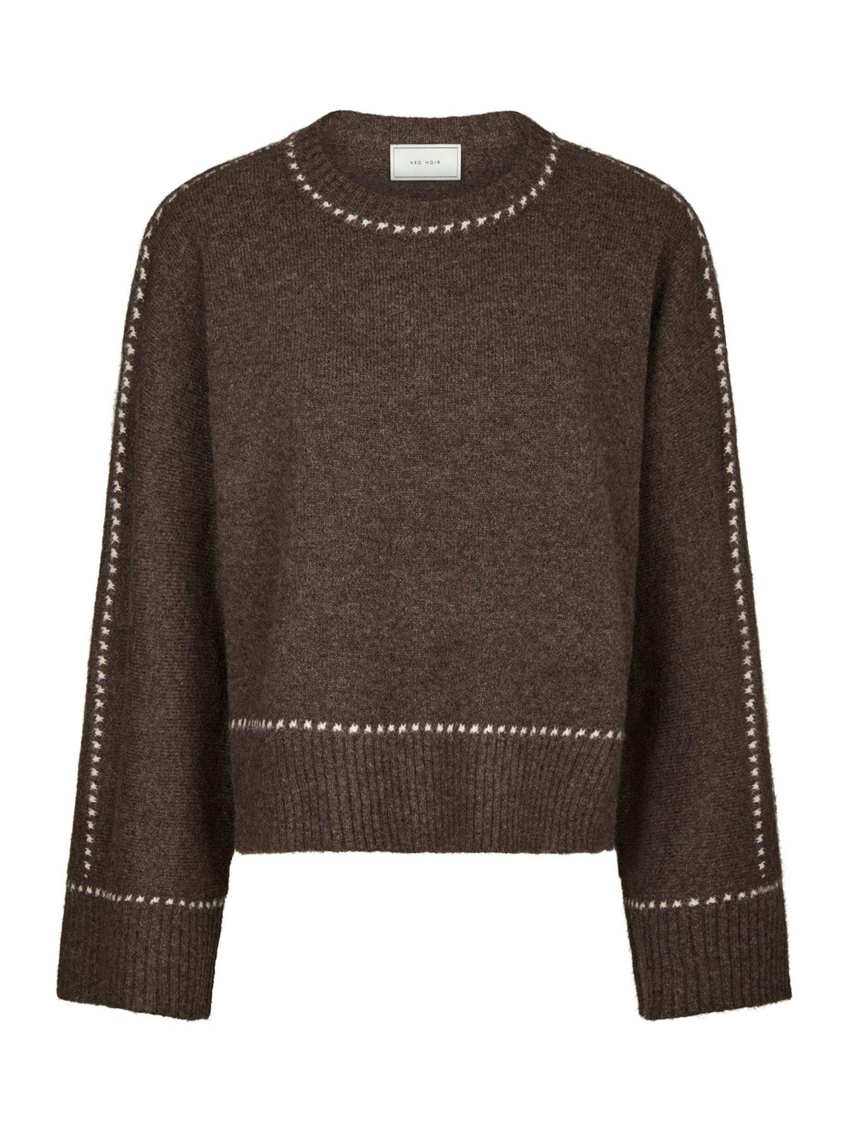 Virkelig lækker striktrøje fra Neo Noir i meleret brun. Roeme Knit Stitch Blouse er med rund hals og har lange løse ærmer. Trøjen har en løs pasform og synlige råhvide stikninger ved halsudskæringen, ærmekanterne og trøjens bund, som giver et virkelig fint look. En skøn strik i sæsonens helt store farve.