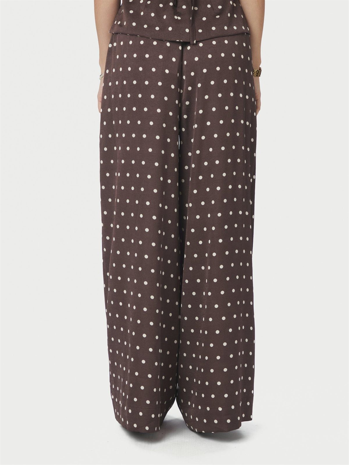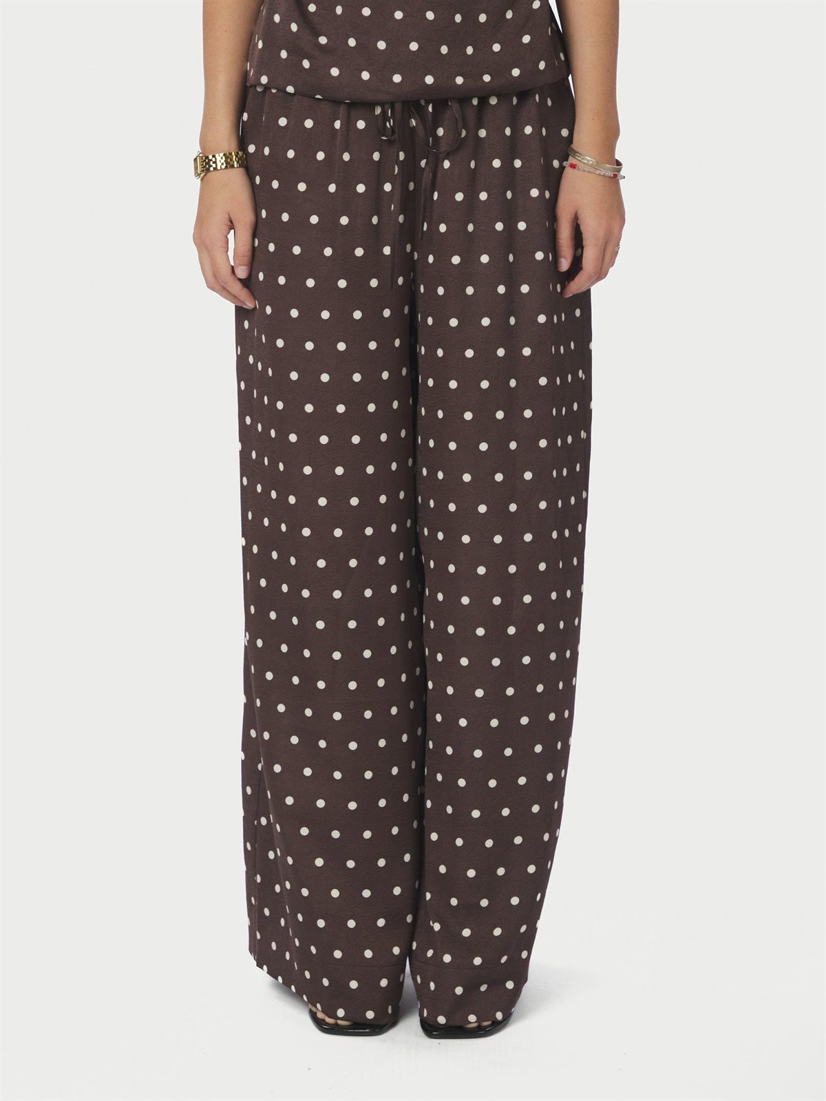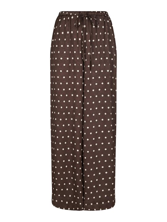 Så fine bukser fra Neo Noir i brun med råhvide prikker. Sebba Big Dot Pants er med elastikkant og snørrer i livet, har lommer i siderne og løse ben. Bukserne er i en smuk let crepet satinkvalitet og falder utrolig flot. En virkelig smuk og elegant style, der med fordel kan styles med matchende top.