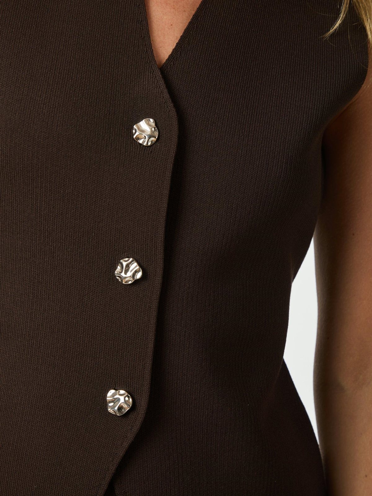 Så fin og feminin strikvest fra Neo Noir i den lækreste strikkvalitet med ribstruktur og stræk. Sway Smooth Knit Waistcoat i mørkebrun er med V-udskæring og lukkes med smukke banket guldknapper som afsluttes med en split åbning fortil. Vesten er med fittet pasform og falder så smukt til din figur. Egner sig godt til en festlig aften i byen eller til hverdag udenover en t-shirt eller skjorte.