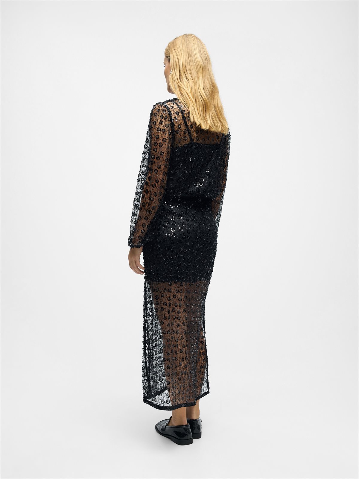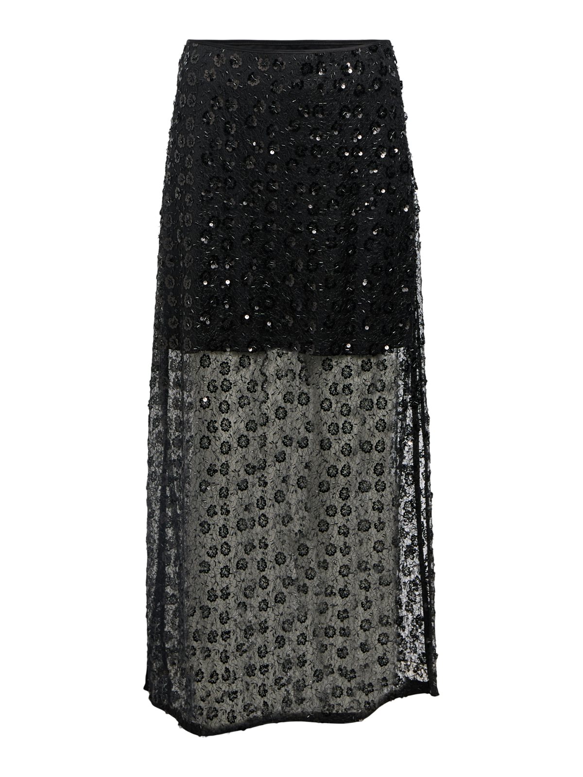 Så feminin og elegant nederdel fra Object i sort med virkelig fine detaljer. Maisy Hw Long Skirt har fast linning og lukkes med lynlås i siden. Nederdelen har slidser i siderne, et kort inderskørt og er prydet med det fineste palliet blomstermønster. En virkelig smuk style, der er oplagt til fest.