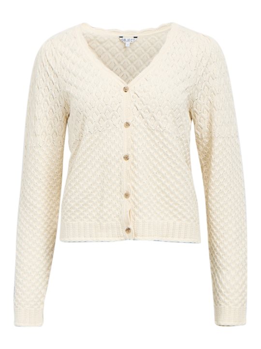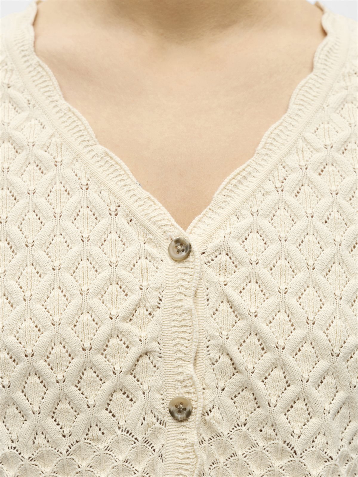 Så fin og feminin strikcardigan fra Object i råhvid. Noa Ls V-Neck Cardigan er i en virkelig smuk strikkvalitet i økologisk bomuld med hulmønster og fine bølgede kanter ved knaplukning og krave. Cardiganen har v-udskæring og lukkes med knapper i front. En tidløs style, der er perfekt til basisgarderoben.