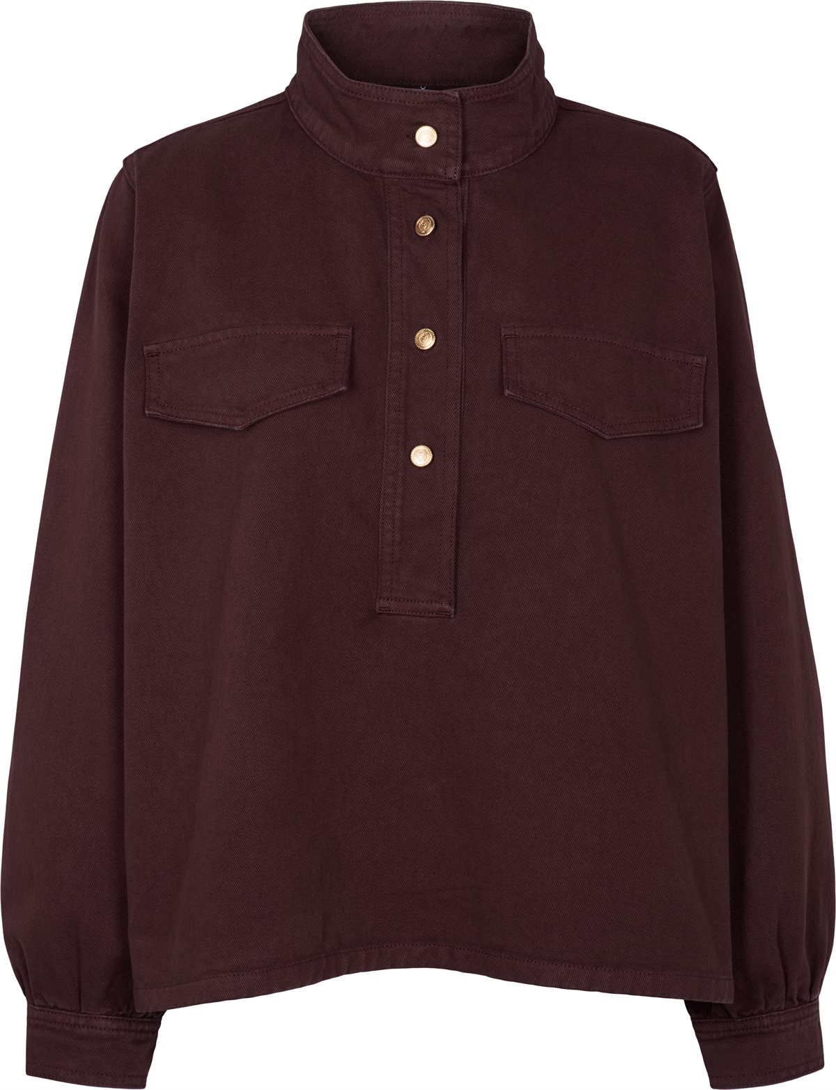 Så fin bluse i en skøn denimkvalitet i den fineste bordeaux farve fra Prepair. Bianca Blouse har en høj krave og en halv knaplukning med fire guldknapper foran. Blusen har to pynte brystlommer og lange ærmer med synlige sømme, hvilket giver et afslappet og råt udtryk. Der findes matchende nederdel til, hvis du vil fuldende looket.