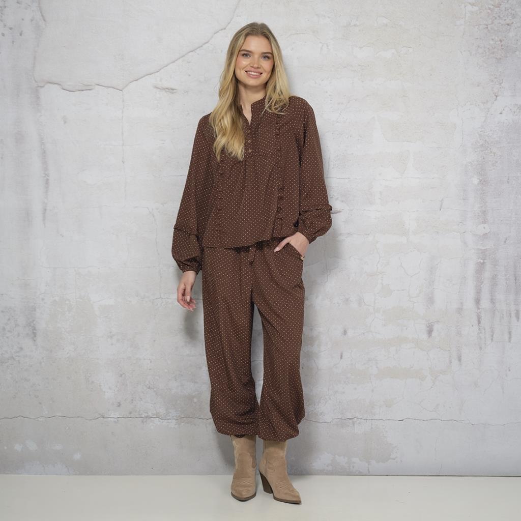 Simpelthen så fin skortebluse fra Prepair i brun med små hvide prikker. Camilla Blouse er med et feminint look og har rund hals med lille V-åbning og knappelukning foran. Blusen har fine flæsedetaljer, der løber lodret langs fronten og på ærmerne og tilfører en romantisk look til designet. Ærmerne er lange med let vidde og afsluttes med elastik ved håndleddene, hvilket giver en behagelig pasform og et let puffet look. Virkelig en fin style, der med fordel kan bruges sammen med matchende buks for et virkelig fint sæt.