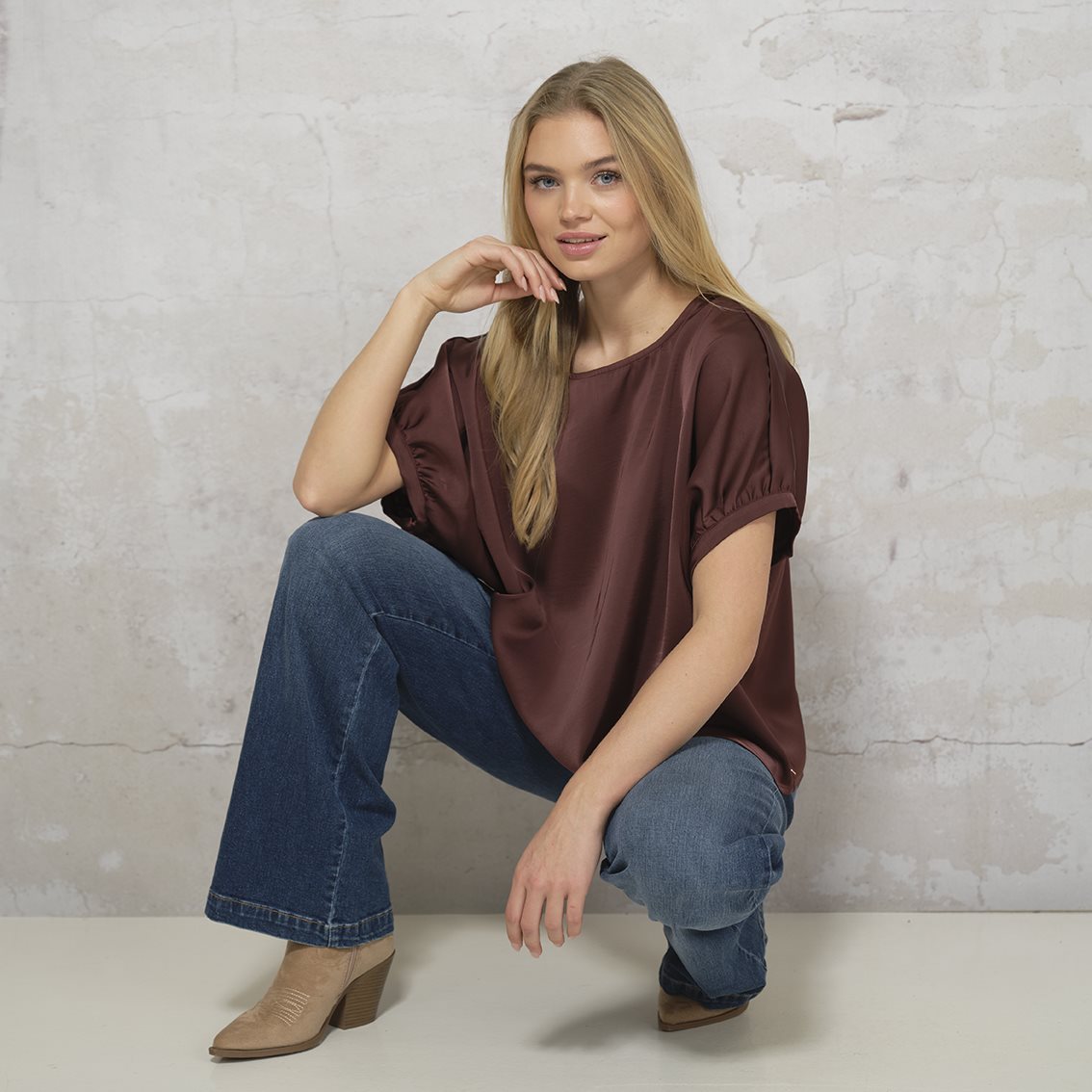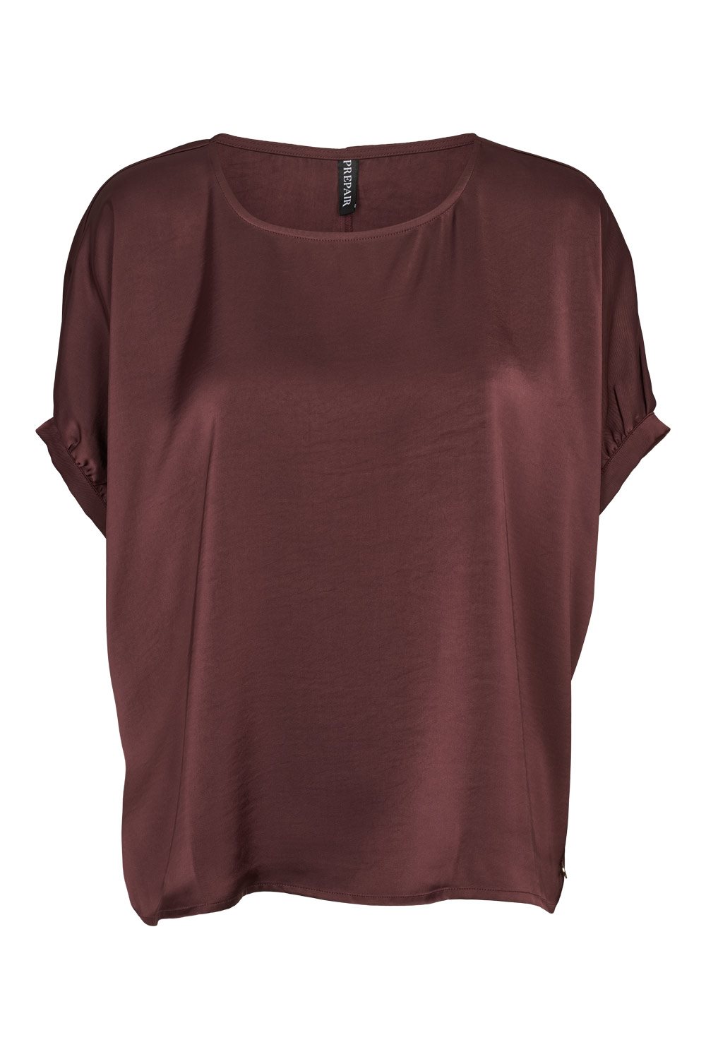 Simpelthen SÅ smuk bluse fra Prepair i flot satinkvalitet i bordeaux. Emily Blouse har et enkelt og elegant udtryk med en blød, rund halsudskæring. Blusen er med korte ærmer, der er let rynkede og afsluttet med et lille opslag, hvilket giver et feminint og afslappet look. Pasformen er løs og behagelig med et smukt fald, som gør den let og luftig at have på. En virkelig fin style, der egner sig både til hverdag og fest.