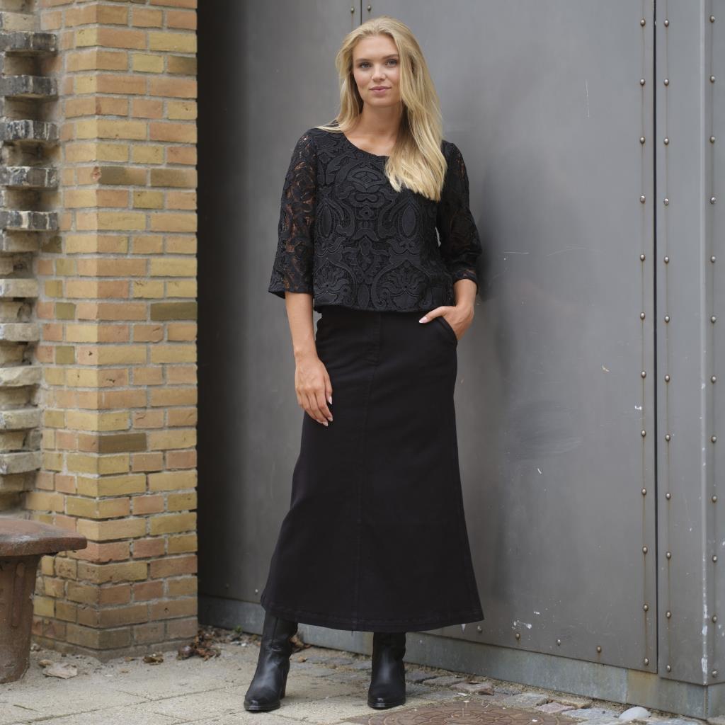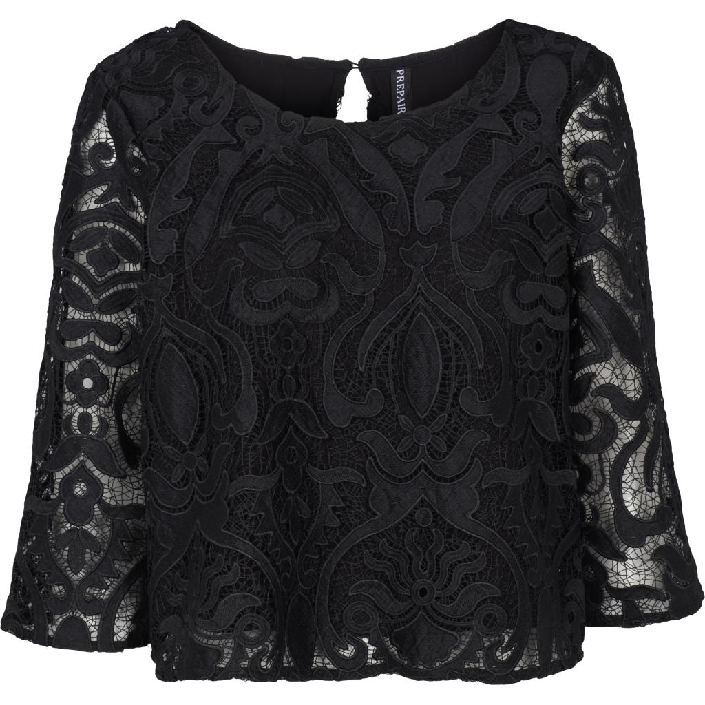 Så smuk blonde bluse / top fra Prepair i sort. Madeleine Blouse er en smuk og feminin blondebluse i en kraftig kvalitet med indsyet viscose stof under, så den ikke er gennemsigtig. Blusen har dog gennemsigtige ærmer 3/4 ærmer. Blusen har rund halsudskæring, løs pasform og går til lidt under bukskanten alt efter højde. Bagtil lukkes den med en lille knap i nakken. Style den til både nederdele, pæne bukser eller jeans til hvedag.