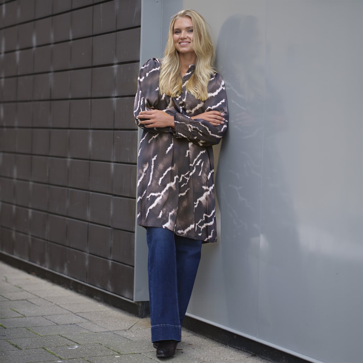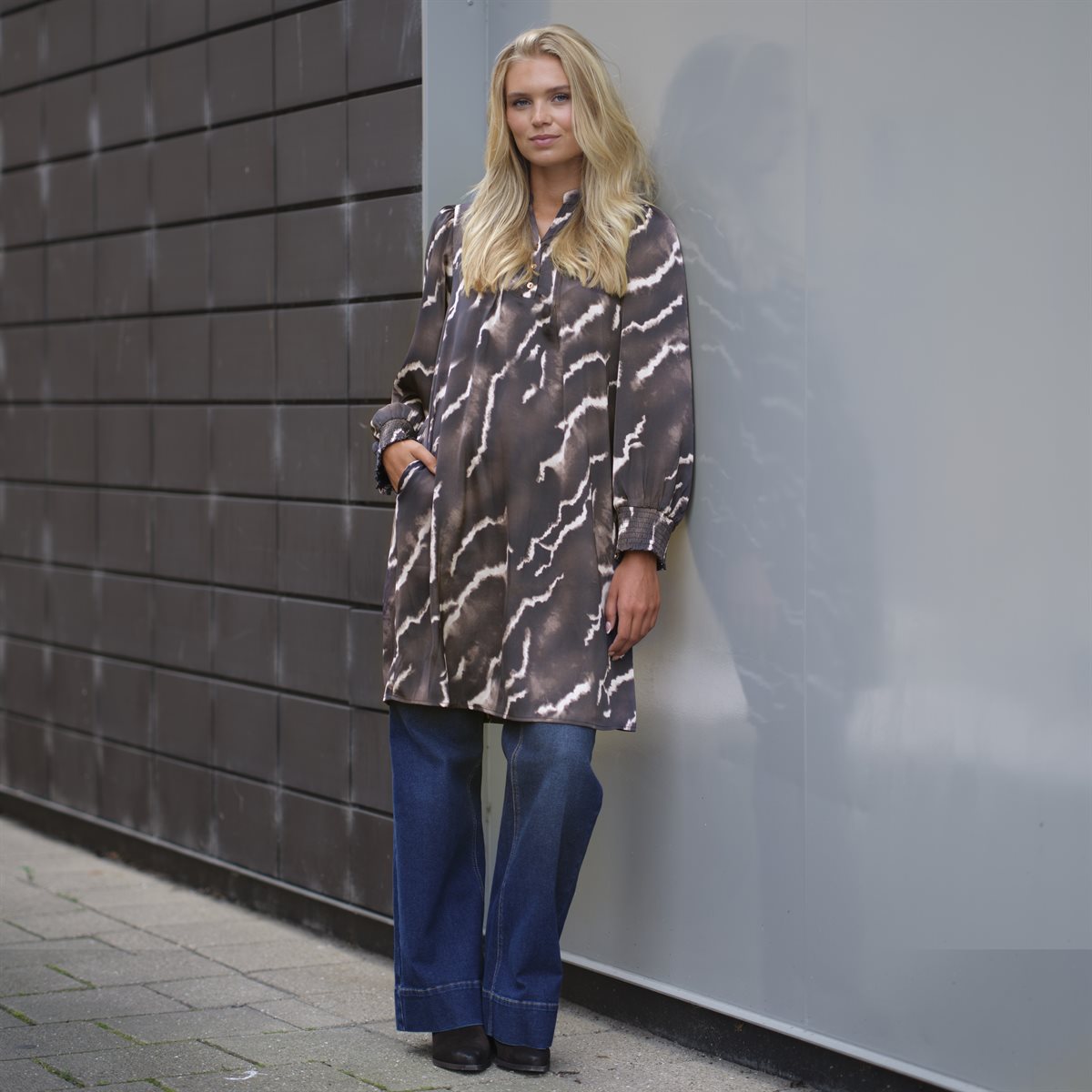 Så smuk kjole fra Prepair i et moderne tie-dye inspireret print i mørke og lyse nuancer. Olivia Dress har rund hals med en lille v-udskæring med knaplukning og fine feminine læg ved brystet. Kjolen har lange ærmer med et let puffede skuldre og smock-detaljer ved håndled. Er i en smuk satinkvalitet og pasformen er løs og behagelig.