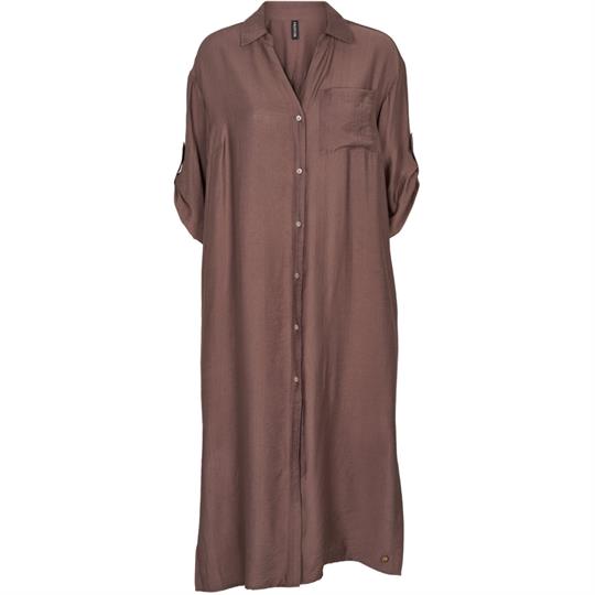 Så fin afslappet skjortekjole fra Prepair i en smuk, varm brun nuance. Thalia Dress har klassisk skjortekrave og gennemgående knaplukning foran, samt skjulte sidelommer. Kjolen har en løs pasform, som skaber en flatterende silhuet. De trekvart lange ærmer kan rulles op og fastgøres med strop og knap, hvilket giver et mere casual look. En diskret brystlomme tilfører et enkelt og moderne touch. Bagpå er kjolen designet med en tværgående syning øverst på ryggen samt et fint læg. Virkelig en lækker og tisløs style.