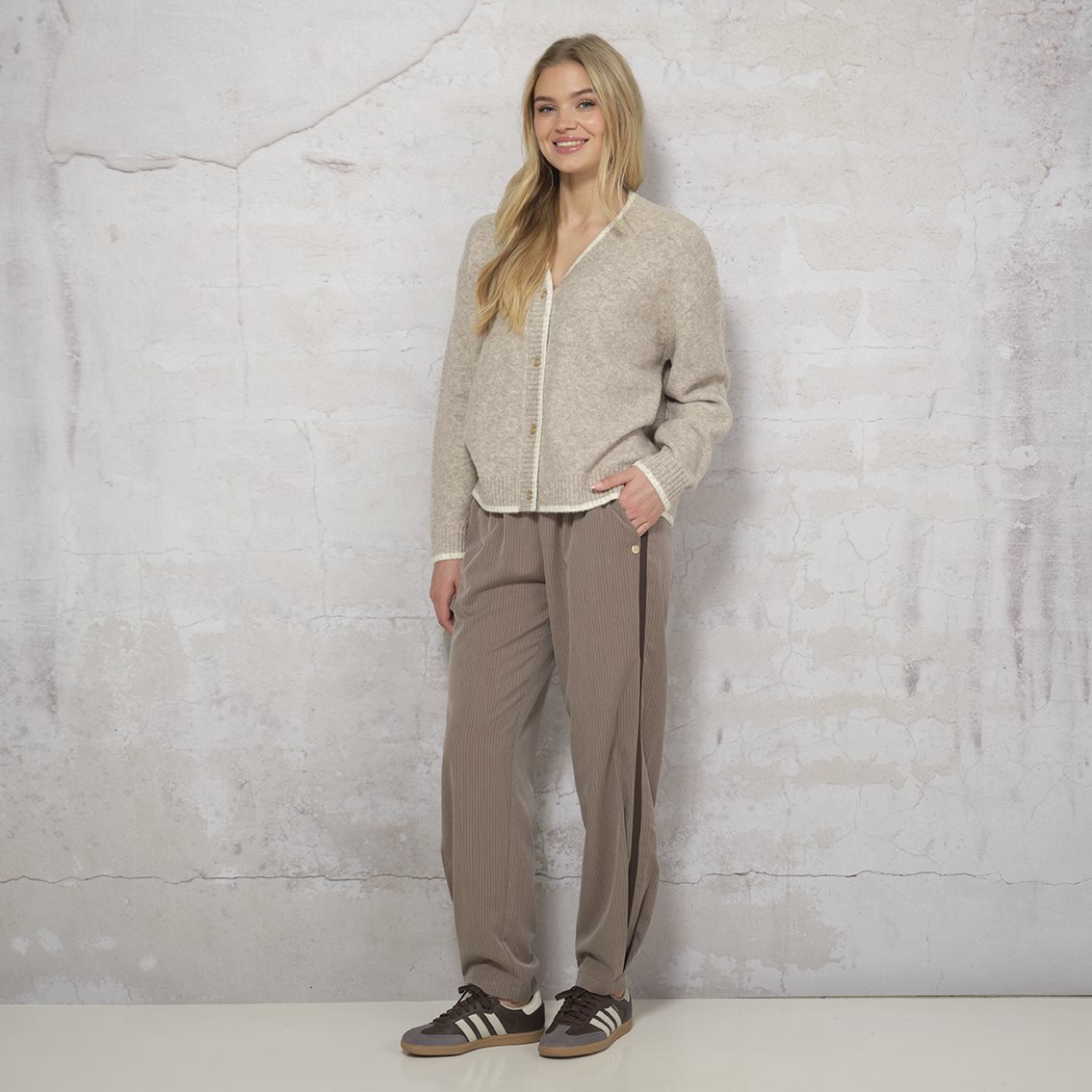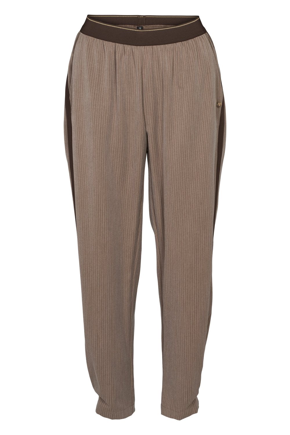Virkelig lækre bukser fra Prepair i sandfarvet med fine detaljer. Violet Pants er et par afslappede bukser med et tidløst, lodret nålestribet mønster og en mørkere kontraststribe på ydersiden, som tilføjer et sporty udtryk. De har en løs og komfortabel pasform, som afsluttes med et elegant lille læg ved anklerne. Taljen er udstyret med en elastisk linning og har sidelommer og pyntelommer bagpå. En virkelig lækker style, der med fordel kan styles med en lækker overdel fra Prepair.